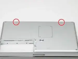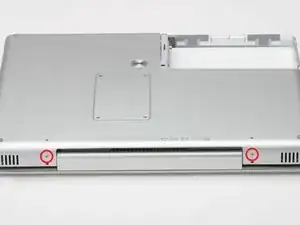 Поверните компьютер ещё на 90 градусов по часовой стрелке и снимите два винта с крестообразным шлицем на внешней стенке отсека батареи.
