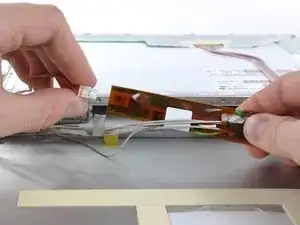 Потяните разъём кабеля передачи данных дисплея от его гнезда, чтобы отключить его от ЖК‑экрана.