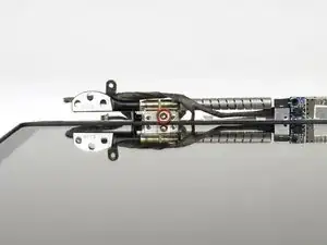 При сборке установите дисплей на место и закрепите винтами Torx кронштейн дисплея, затем закройте крышку и положите ноутбук экраном вниз, чтобы проверить выравнивание экрана по корпусу. При необходимости ослабьте винты, отрегулируйте положение дисплея и снова затяните их.
