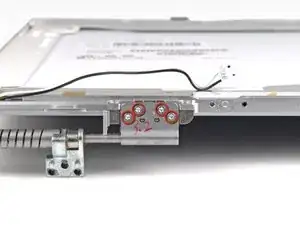 Удалите четыре винта Torx T6 длиной 3,5 мм, фиксирующие правую петлю сцепления к передней рамке дисплея.