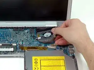Удалите три серебряных винта T6 Torx, фиксирующих правый вентилятор на материнской плате и нижней крышке.