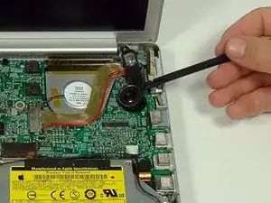 Поднимите левую сторону логической платы и отключите кабель модема от нижней стороны платы. Лопатка полезна для отделения разъема от клея.
