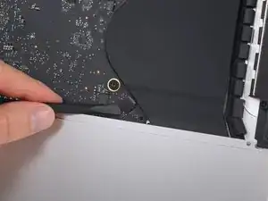 Возможно, потребуется отодвинуть клей по краю дисплея внизу корпуса iMac, чтобы получить доступ к винтам.