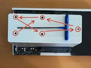 Используйте шестигранный ключ, чтобы открутить пружинный винт, следуя звёздчатой схеме на радиаторе процессора для равномерного давления на кристалл процессора. Это особенно важно при установке радиатора обратно.