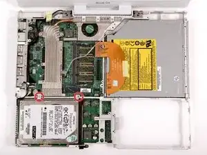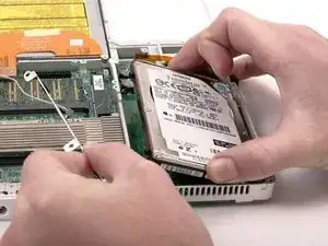 Удалите два винта Phillips, крепящих жёсткий диск к металлическому каркасу.