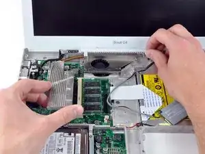 При сборке iBook убедитесь, что вы подключили кабель клавиатуры перед установкой экрана защиты оперативной памяти.