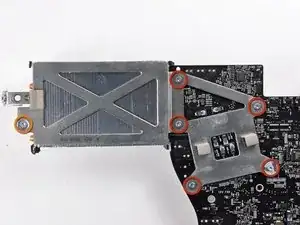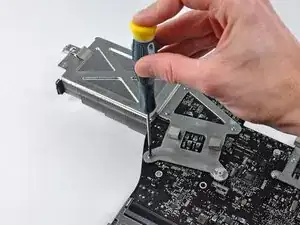 Удалите один винт T10 Torx длиной 13 мм, фиксирующий вентилятор оптического привода к корпусу.