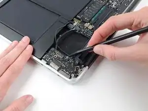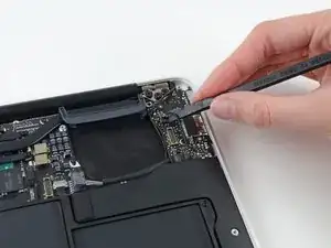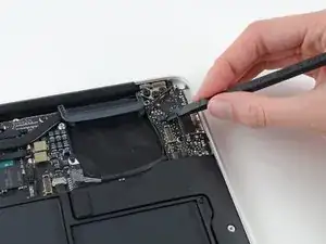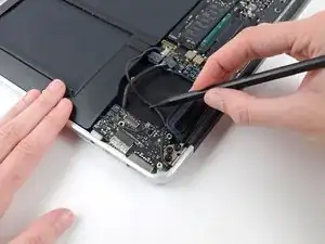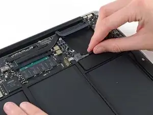 Возьмитесь за прозрачную пластиковую язычок, прикреплённый к разъёму батареи, и потяните его параллельно плате в направлении переднего края Air.