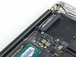 Снимите два винта T8 Torx 4,9 мм, фиксирующие держатель антенны на левом шарнире дисплея к верхней крышке.