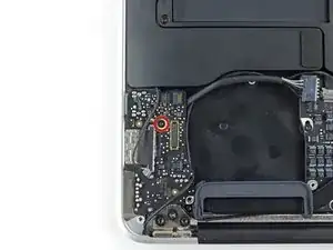 Снимите один винт T5 Torx 3,6 мм, фиксирующий плату ввода/вывода к верхней крышке.