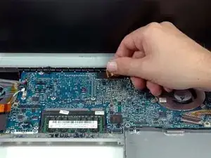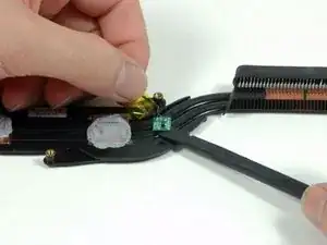 Удерживая логическую плату одной рукой, другой рукой поднимите левый вентилятор из его посадочного места. На радиаторе есть кусок чёрной ленты, фиксирующей вентилятор. Аккуратно оторвите эту ленту от радиатора по мере подъёма вентилятора.