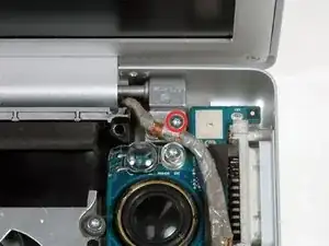 Снимите серебристый винт Torx T6, крепящий заземляющую петлю в кабеле передачи данных дисплея к корпусу.