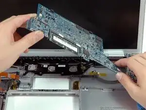Возьмитесь за логическую плату за левую сторону и за тонкую часть, и поверните плату, выводя её из нижнего корпуса.