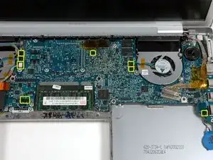 Восемь серебристых винтов Torx T6 4,7 мм, крепящих логическую плату к нижней части корпуса.