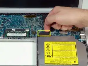 Отключите оранжевый лентовый кабель SuperDrive от логической платы, при необходимости удалив ленту.