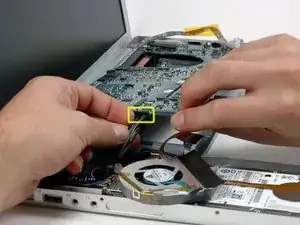 Поднимите левую сторону логической платы и отключите серо-чёрный силовой кабель от нижней части платы.