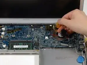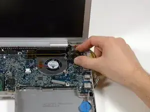 Поместите вентилятор над картой Airport. Полностью извлекать вентилятор из компьютера необязательно.