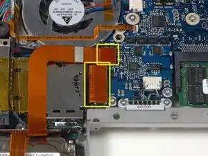 Отключите оранжевый шлейф SuperDrive от логической платы, при необходимости удаляя ленту.