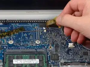 Отключите шлейф трекпада и клавиатуры от логической платы, при необходимости удаляя ленту.