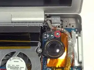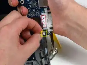 Удалите серебристый винт T6 Torx, закрепляющий заземляющую петлю на кабеле передачи данных дисплея к корпусу.