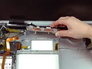 Сдвиньте кабель передачи данных дисплея вправо, при необходимости снимая ленту.
