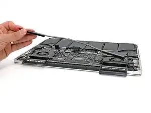 Подденьте нижнюю крышку с края, ближе к крышке защёлки, и поднимите её с MacBook Pro.