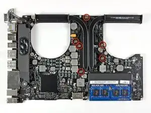 Снимите три винта T6 Torx длиной 3,4 мм (3,1 мм), крепящие правый вентилятор к плате логики.