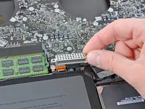 Если есть пластиковая язычок, захватите его и потяните разъём батареи к переднему краю устройства. Для моделей конца 2011 года разъём батареи не имеет язычка и представляет собой штекер, который вставляется прямо в материнскую плату — чтобы снять, подденьте штекер прямо вверх.