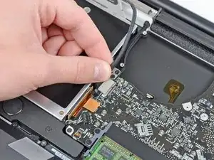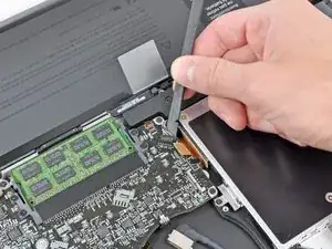 Используйте плоский конец лопатки, чтобы приподнять разъём кабеля жёсткого диска и вынуть его из разъёма на логической плате.