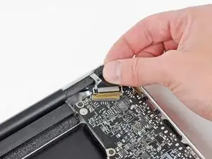 Поднимите чёрную пластиковую защёлку, прикреплённую к фиксатору кабеля данных дисплея, и поверните её в сторону разъёма питания (DC-In) MacBook.
