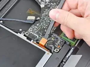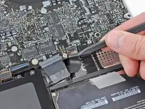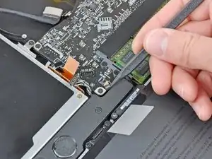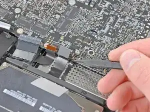 Используйте плоский конец лопатки, чтобы поддеть разъём трекпада и вывести его из гнезда на логической плате.