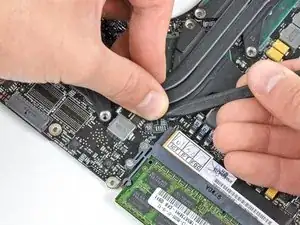 Если радиатор кажется приклеенным к логической плате после снятия всех восьми винтов, может помочь использование лопатки для разделения компонентов.