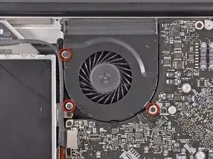 Снимите три винта Phillips 3.1 мм, крепящие левый вентилятор к логической плате.