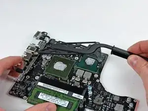 Используйте плоский конец лопатки, чтобы отогнуть шлейф AirPort/Bluetooth от логической платы.