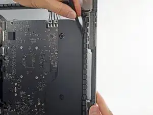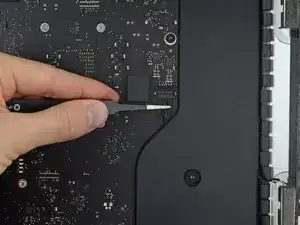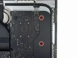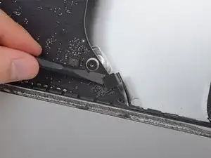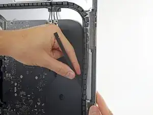 Вам может понадобиться отслоить клей дисплея по нижнему краю корпуса iMac, чтобы получить доступ к винтам.
