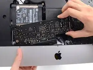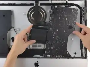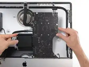 Не пытайтесь полностью извлечь блок питания из iMac — он всё ещё подключён к логической плате.