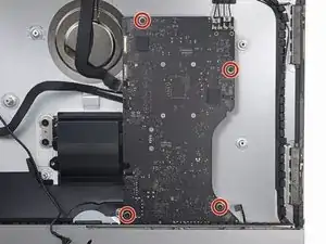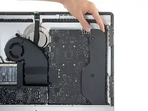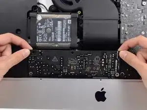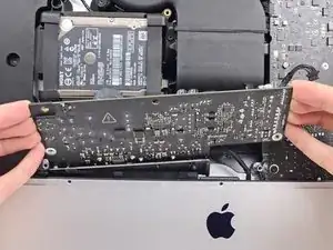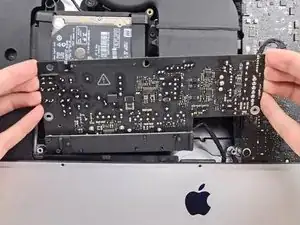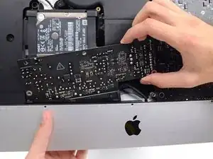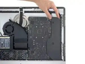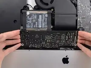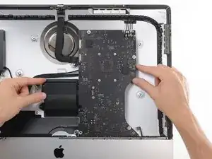 Поднимите логическую плату прямо вверх и выньте её из iMac.