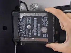 Удалите винт T8 Torx длиной 7,3 мм, крепящий лоток жёсткого диска к задней крышке.