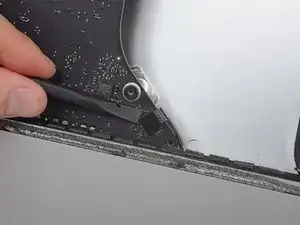 Начав с левой стороны дисплея, возле кнопки питания, вставьте инструмент для вскрытия iMac в зазор между стеклянной панелью и задней крышкой.