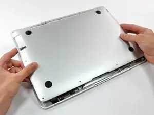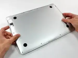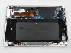 Снимите десять винтов с крестовой шлицем, крепящих нижнюю крышку к MacBook Air: