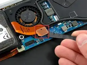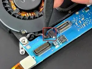 С помощью конца лопатки отсоедините разъём кабеля вентилятора, потянув его прямо от логической платы.