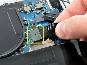 С помощью лопатки подденьте разъём кабеля жёсткого диска и отсоедините его от логической платы.