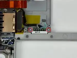 Удалите два серебристых винта Torx T6, закрепляющих разъём батареи к нижнему корпусу.