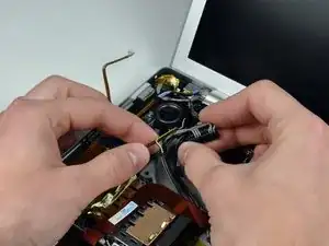 Удерживая плату логики одной рукой, другой рукой поднимите левый вентилятор из его корпуса. Чёрная лента фиксирует левый вентилятор к радиатору. Аккуратно отлепите эту ленту от радиатора по мере подъёма левого вентилятора.