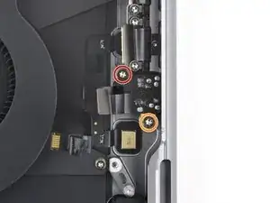 Используйте отвертку Torx 3IP, чтобы выкрутить девять винтов длиной 2.1 мм, фиксирующих четыре крышки разъёмов справа на плате логики.