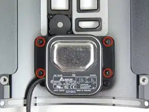 Удалите четыре винта Torx T8 длиной 5,5 мм, крепящих блок питания к корпусу Mac Pro.