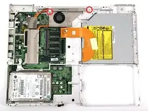 На этом фото отсутствует Bluetooth-антенна, которая есть в некоторых iBook. Она расположена в верхнем правом углу отсека аккумулятора, прямо над винтом 4 мм. Кронштейн антенны виден на фото — это две отверстия в форме буквы I прямо над винтом 4 мм, которые нужно снять на этом шаге. Чтобы снять антенну, сдвиньте её в сторону ЖК-дисплея и наклоните вертикально назад к себе.