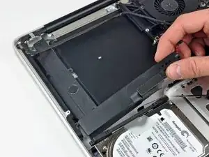 Используйте плоский конец лопатки, чтобы отсоединить разъём кабеля жёсткого диска/ИК-датчика от системной платы.