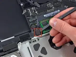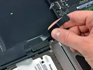 Apple фиксирует небольшую полоску прозрачного пластика с клейким слоем на системной плате за разъёмом кабеля камеры, чтобы держать его на месте. При перемещении этой полоски будьте осторожны, чтобы не повредить поверхностно монтируемые компоненты на системной плате.