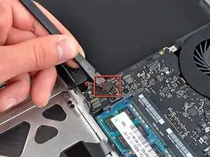 Наклоните аккумулятор в сторону от платы логики, чтобы получить доступ к разъёму кабеля аккумулятора.